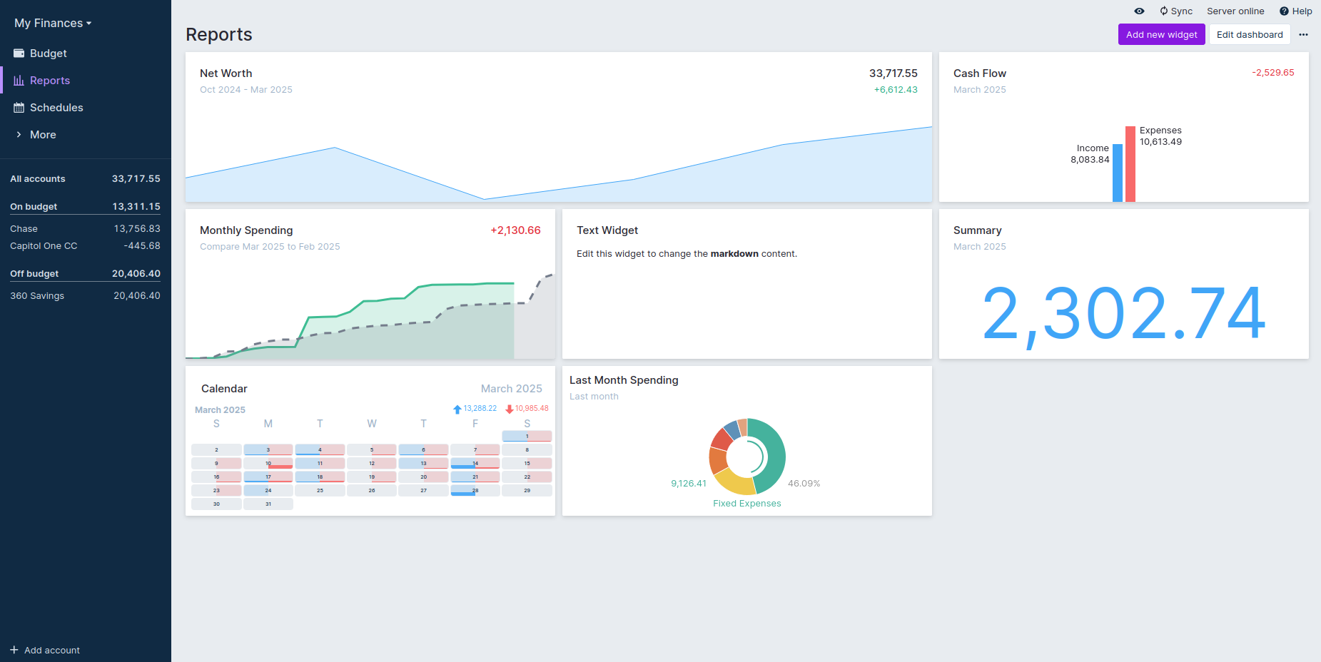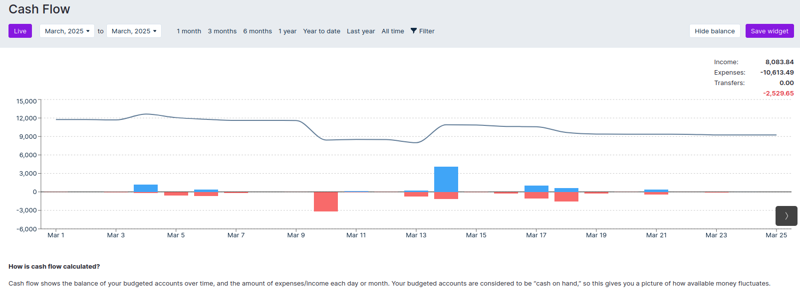 Cash flow shows your spending over time. It only looks at budgeted accounts and shows their balance over time, and includes separate income and expense visualizations. It's a quick way to see how your income and expenses affected your available money over time. Your budgeted accounts are considered to be “cash on hand,” so this gives you a picture of how available money fluctuates.