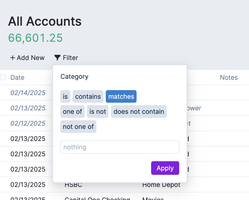 - Split transactions do not behave well in the filtered view. The non-applicable part of the filtered results can end up getting added into the total.