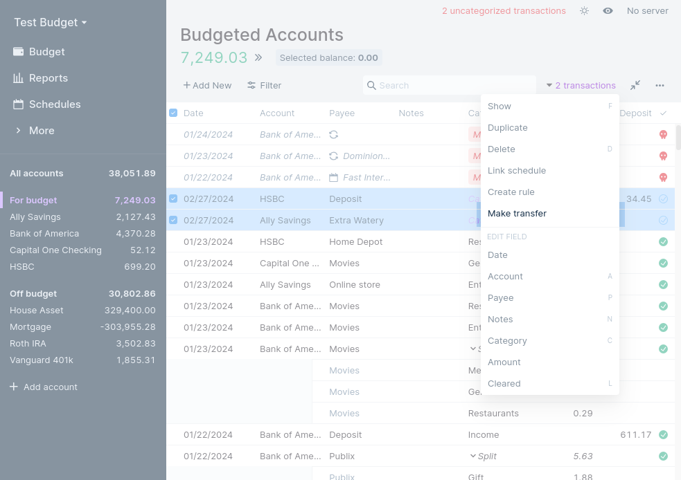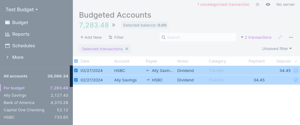 If you want to transfer money between accounts, you will want to do it in a way that doesn't mess up reports. If you only created two transactions, Actual would have no way of knowing they are a single transfer and can be ignored in reports.