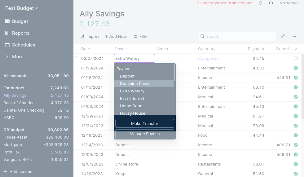 Delete a transfer the same way you delete any transaction: hover over it and press the X on the left. Deleting a transfer transaction always deletes both the transaction in the currently open account, as well as the transfer transaction in the other account.